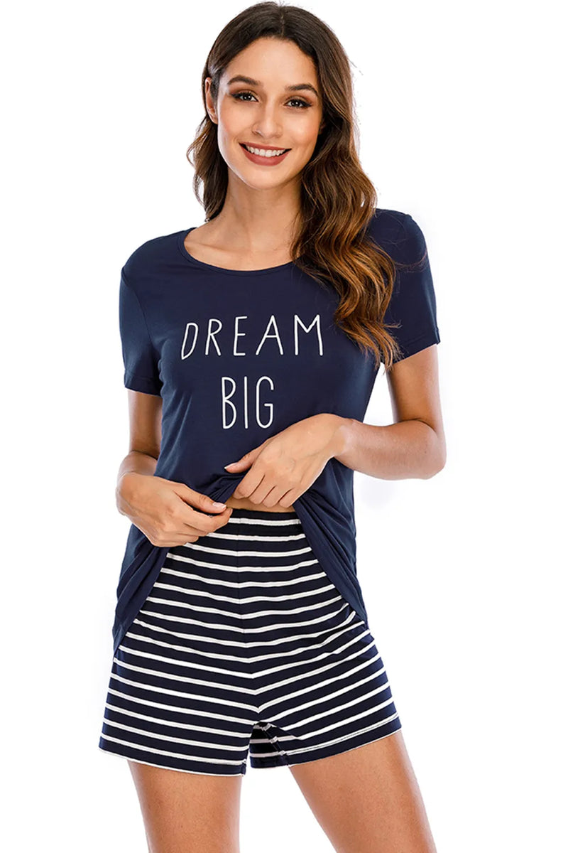 Graphic Round Neck Top and Striped Shorts Lounge Set