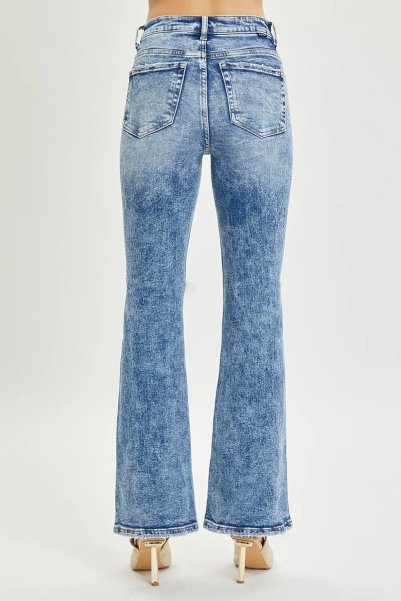 These high-rise distressed flare jeans are a trendy and edgy addition to your denim collection. The high-rise waist offers a flattering fit and elongates your silhouette. The distressed detailing adds a touch of vintage-inspired style and a hint of rebelliousness. The flare leg creates a retro 70s vibe that is both fun and fashionable. Pair these jeans with a tucked-in blouse and heels for a chic evening look, or with a graphic tee and sneakers for a more casual outfit. Elevate your denim game with these stylish high-rise distressed flare jeans.