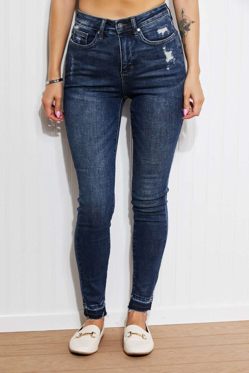The tummy control jeans are back, this time in a dark wash skinny! Feel confident and comfortable with their slimming design, modern distressing details near the pockets, and a cute raw hem.