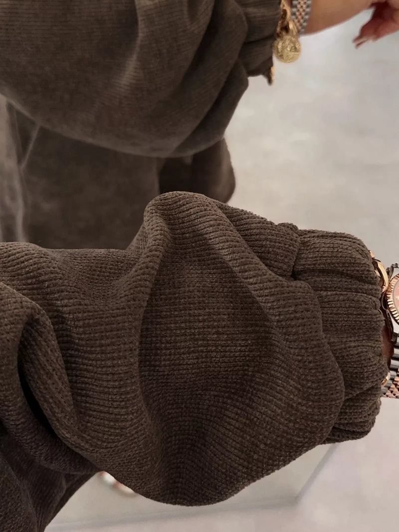 Casual Corduroy Long Sleeve Top and Drawstring Shorts Set