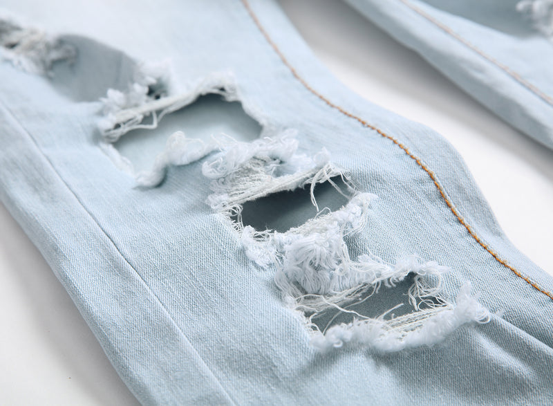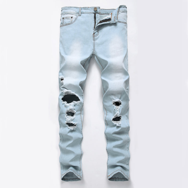 Men's Foreign Trade Light White Blue Big Hole Slim Jeans